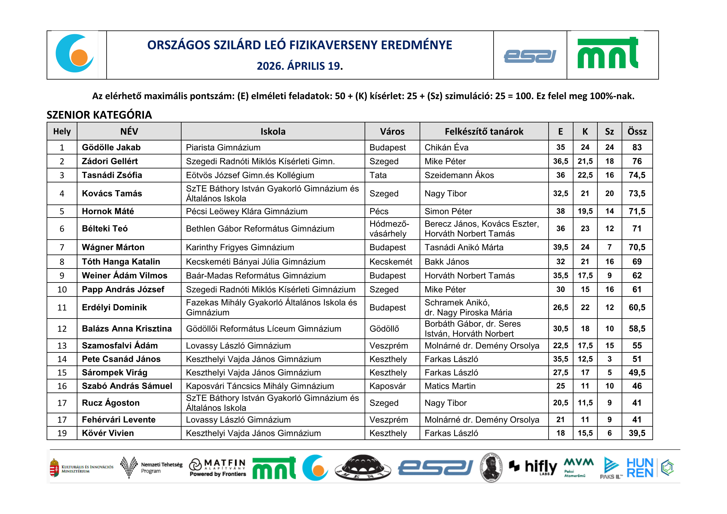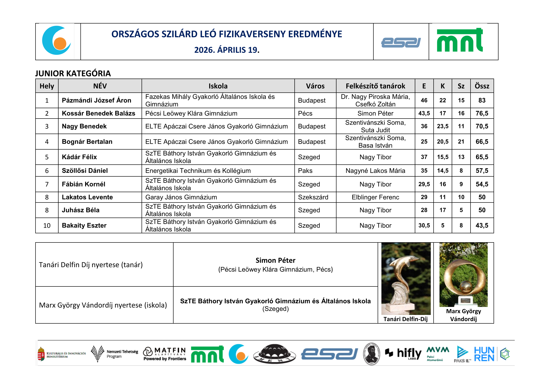 28. Országos Szilárd Leó Fizikaverseny Eredménye